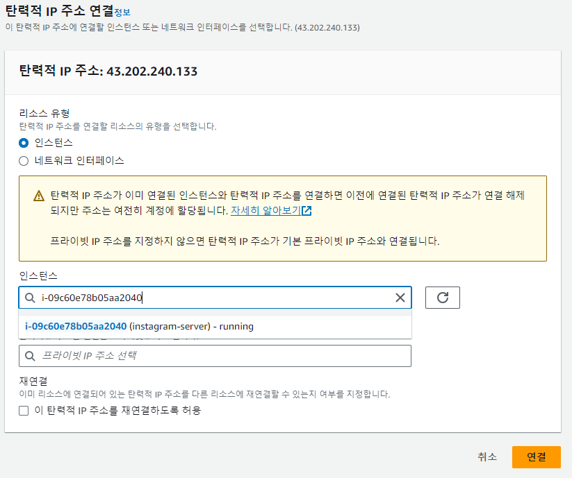3. 작업> 탄력적 IP주소 연결 >인스턴스 선택>연결