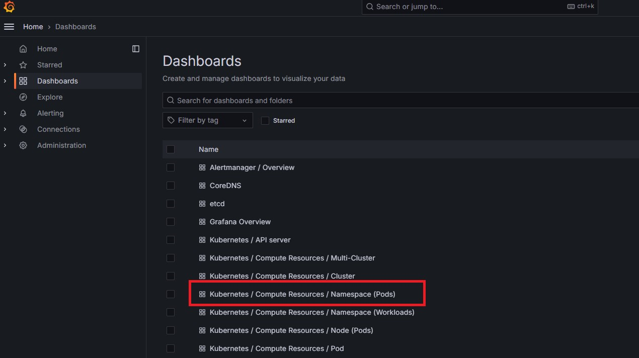 두 UI에 모두 접근할 수 있으면 Grafana 대시보드> Kubernetes / Compute Resources / Namespace (Pods)로 이동합니다.