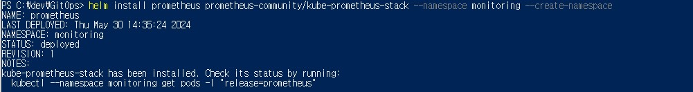 - monitoring 이라는 새 네임스페이스에 Helm Chart를 설치하는 것입니다